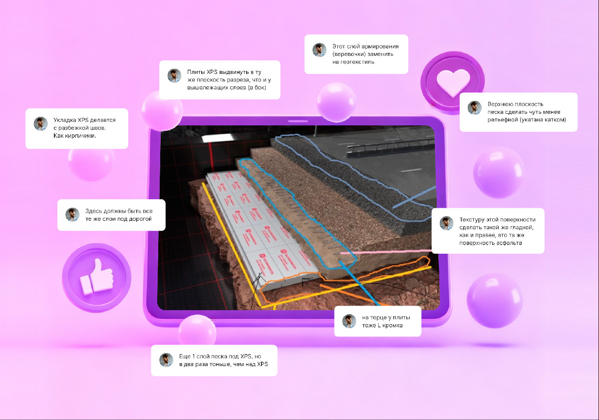 Со стороны клиента к процессу подключился технический специалист, ставший нашим главным навигатором. Мы получали подробнейшие комментарии: «Геотекстиль должен быть шире, чем плиты XPS», «Сильнее выделите стыки плит». Создавая 3D-ролик, важно не увлекаться художественными образами в ущерб точности, и здесь помощь эксперта была бесценна.