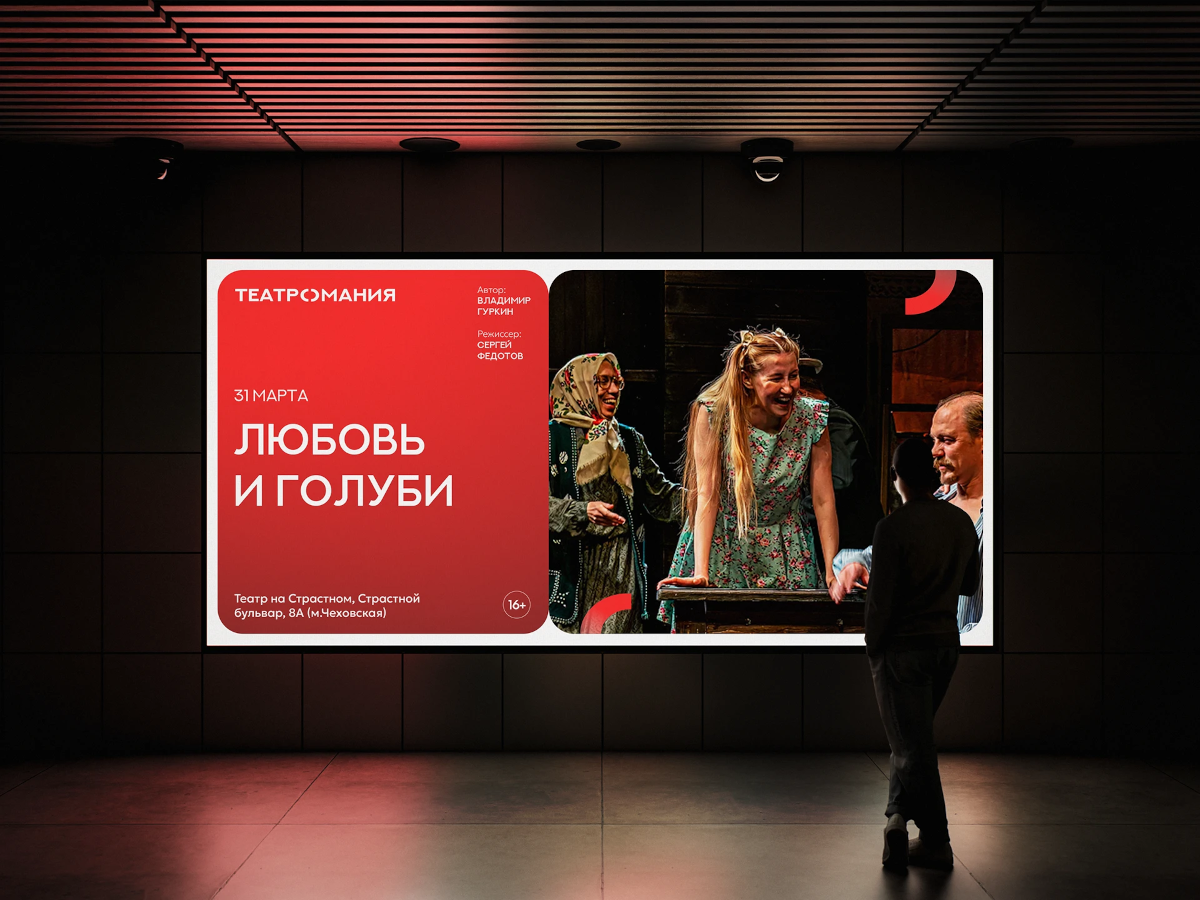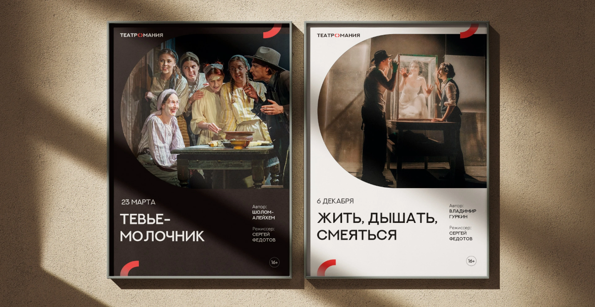 Визуальная концепция «Театромании» выстроена на тщательно продуманных деталях: гармоничном соотношении шрифтов, фирменных геометрических масках, работе с пропорциями и композицией. Такой подход формирует узнаваемый характер айдентики, которая одинаково уверенно работает как в цифровой среде, так и на классических театральных носителях — афишах, баннерах и печатных материалах.