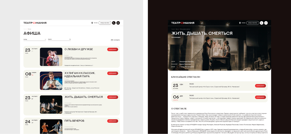 На внутренних страницах мы сфокусировались на простоте навигации и ясной структуре, чтобы пользователи легко находили нужные разделы и информацию, а так же удобно оформляли покупку билетов на выбранный спектакль. Кроме того, система легко расширяется: новые проекты, фестивали, онлайн-форматы — всё визуально встаивается в общую матрицу.