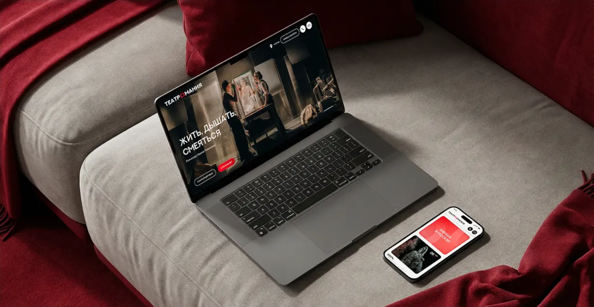 Дизайн-концепция сайта «Театромании» построена как сценарий: от яркого эмоционального открытия — к насыщенному потоку проектов и живому ритму новостей. Блоки взаимодействуют друг с другом через контраст, масштаб и движение, создавая ощущение непрерывного театрального процесса.