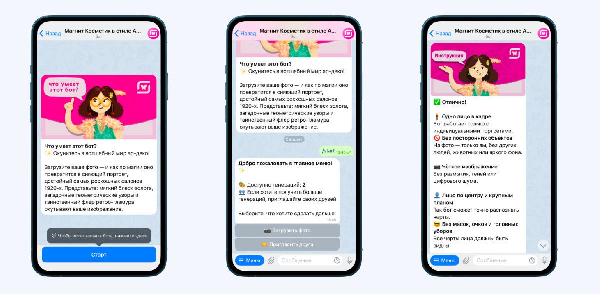 Для сети «Магнит» был создан Telegram-бот с интеграцией нейросетевой генерации изображений в стиле ар-деко. Проект стал частью промо-акции, в рамках которой пользователи могли загрузить фотографию и получить уникальный портрет с фирменным логотипом. Дополнительным драйвером роста базы стала рефераль