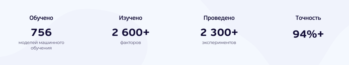 Разработкой и обучением моделей занимались партнеры Заказчика из НИУ «Высшая школа экономики». Команда математиков обучила более 700 моделей и провела свыше 2300 экспериментов. Полный цикл обучения занимает 20 минут, а формирование прогнозов – 2-3 минуты.