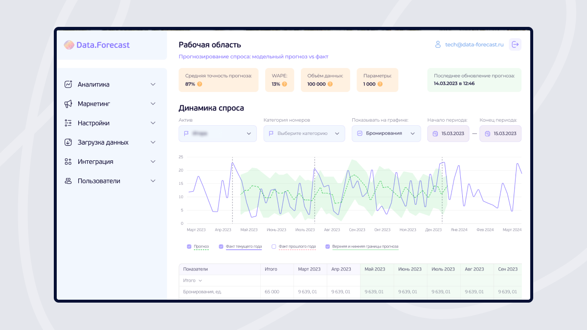 Data.Forecast — это первая российская разработка, учитывающая специфику локального рынка и не зависящая от зарубежных технологий. Она представляет собой интеллектуальную веб-платформу, предназначенную для оптимального планирования в маркетинге и высокоточных прогнозов загрузки и выручки, основанных на технологиях искусственного интеллекта.
