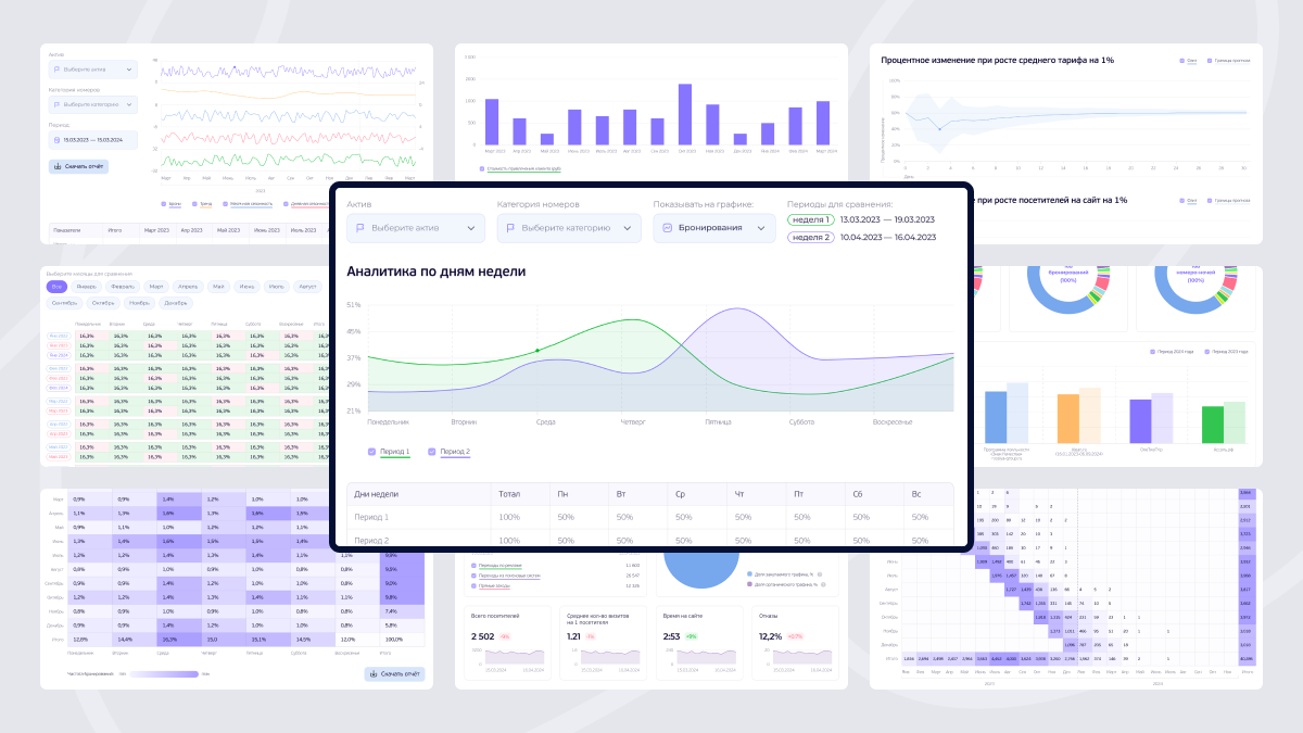 Система позволяет анализировать комбинации отелей и категорий номеров, что помогает эффективно управлять доходами и оперативно корректировать стратегии при критических отклонениях. Для удобства пользователей интегрированы визуальные подсказки.
