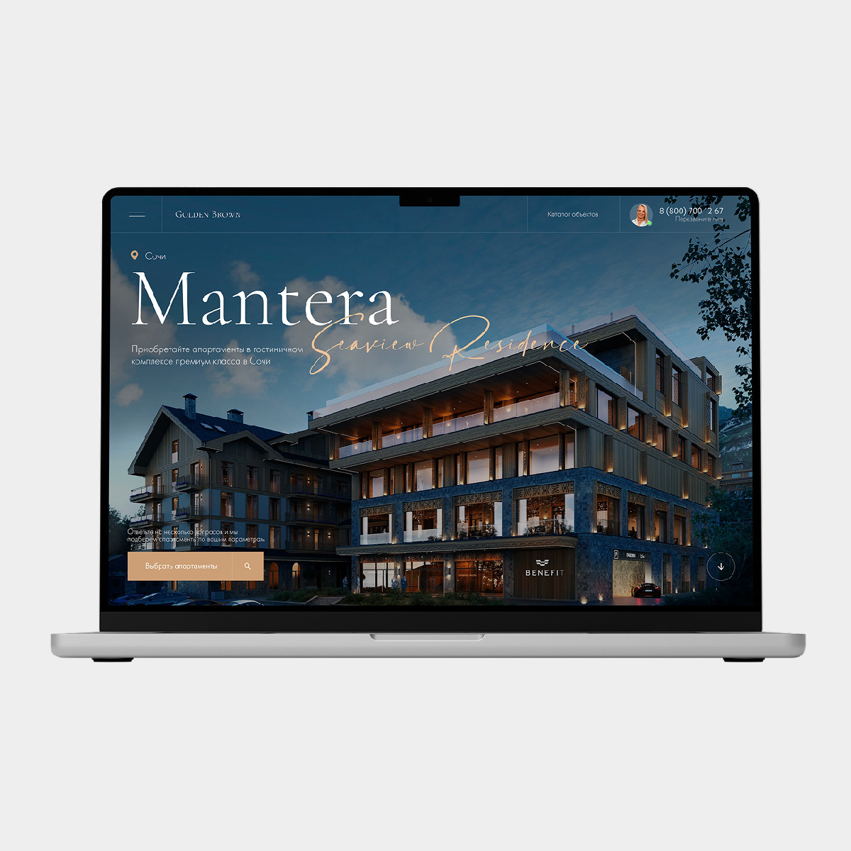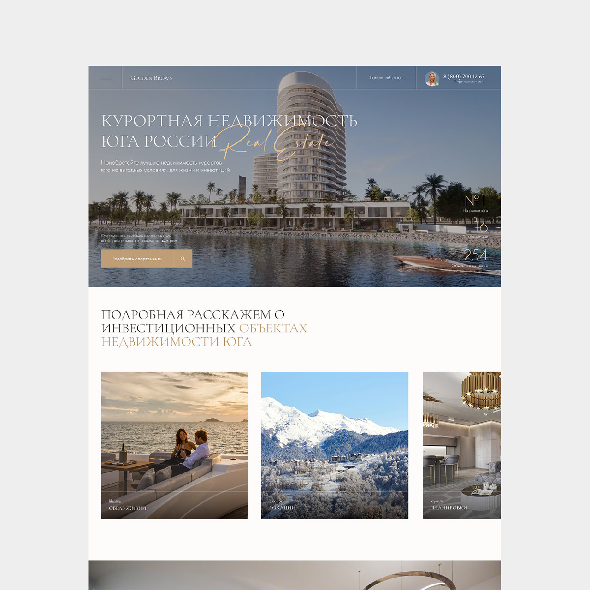 Разработан корпоративный сайт для агентства премиальной недвижимости Golden Brown с интеграцией под SEO и контекстную рекламу. Созданы лендинги для различных объектов элитной недвижимости, реализована имиджевая часть бренда через дизайн и контент. Сайт ориентирован на клиентов премиального сегмента.