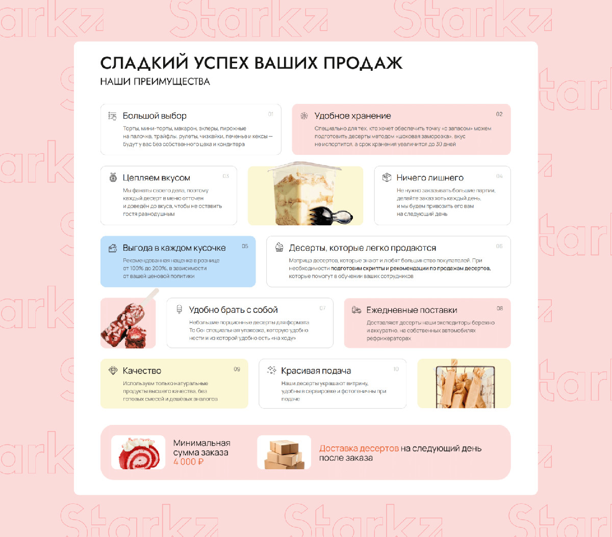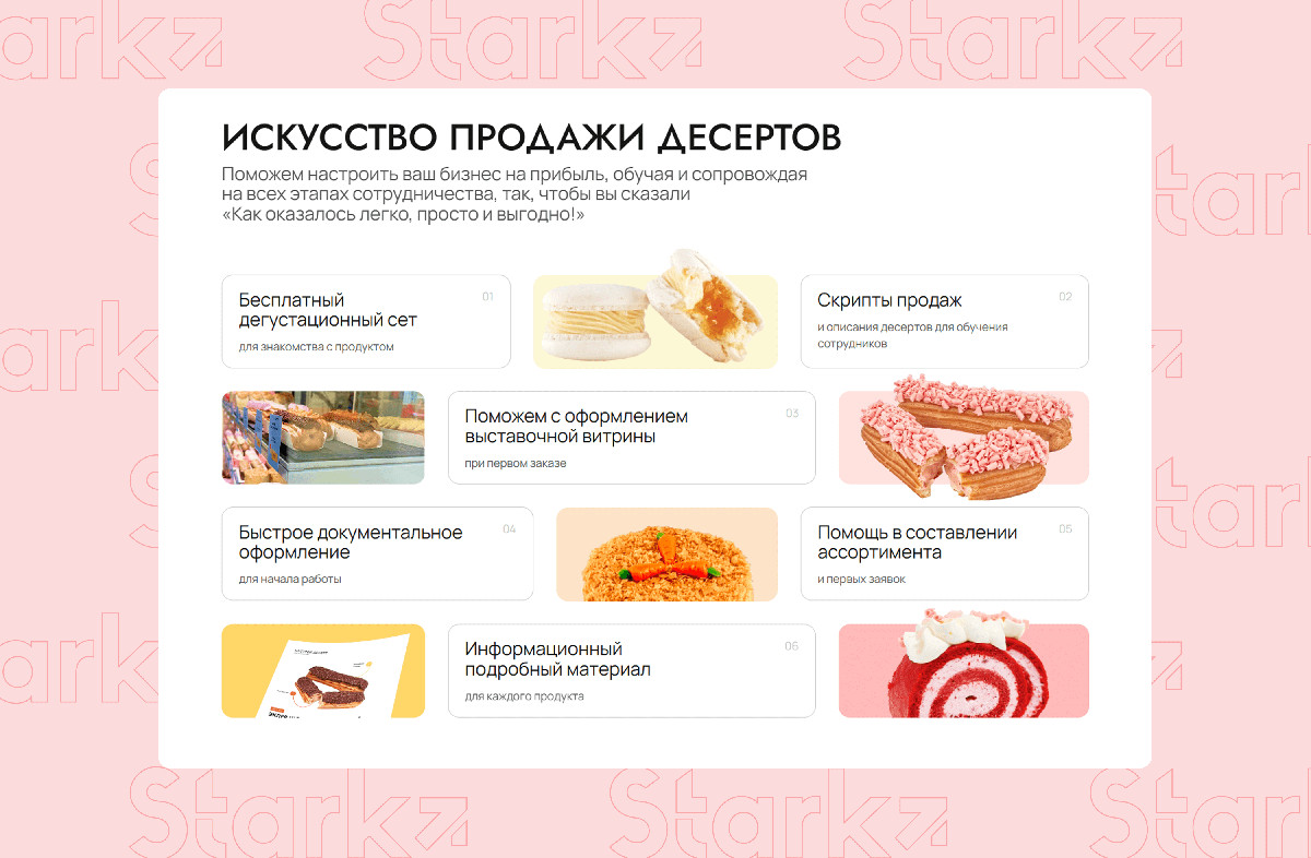 Следом идет блок с самыми продаваемыми позициями с заголовком «Хиты продаж. Незабываемый вкус и высокая прибыль», подчеркивая уникальность и лишний раз отсылая к натуральности десертов, которые принесут прибыль. А закрепляет идею рентабельности блок с преимуществами «Настрой десерта», где каждый пункт эффективно закрывает ключевые потребности B2B-клиентов. Такой блок не просто информирует, а снимает возражения на этапе переговоров и подталкивает к заказу.