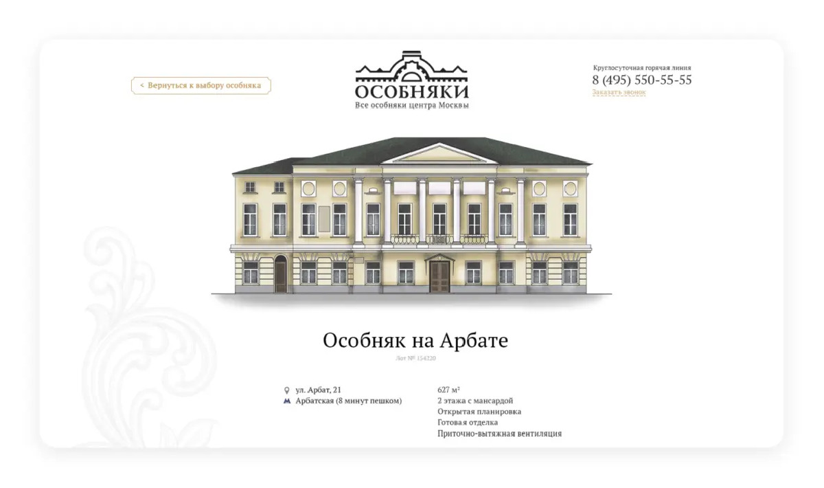 - Особняки: тут была проблема — старые здания часто выглядят плохо на фото. Мы нашли изящное решение: отрисовали каждый особняк вручную в акварельной стилистике. Это добавило премиальности и скрыло недостатки фасадов.