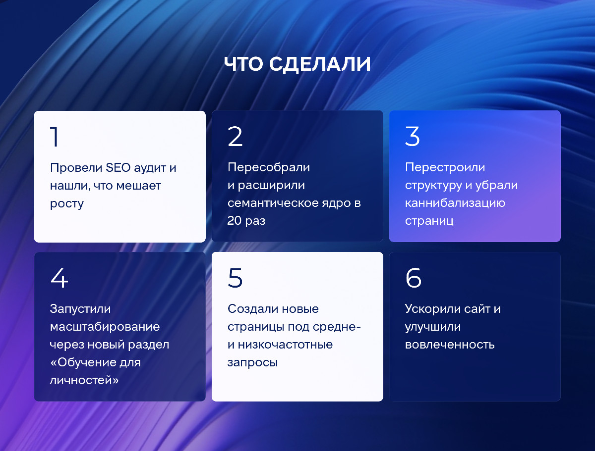 Речь шла не о быстром росте любой ценой. Курсы дорогие, продукт сложный, бренд — чувствительный к качеству. Значит, и SEO-решение должно было быть аккуратным, долгосрочным и устойчивым.