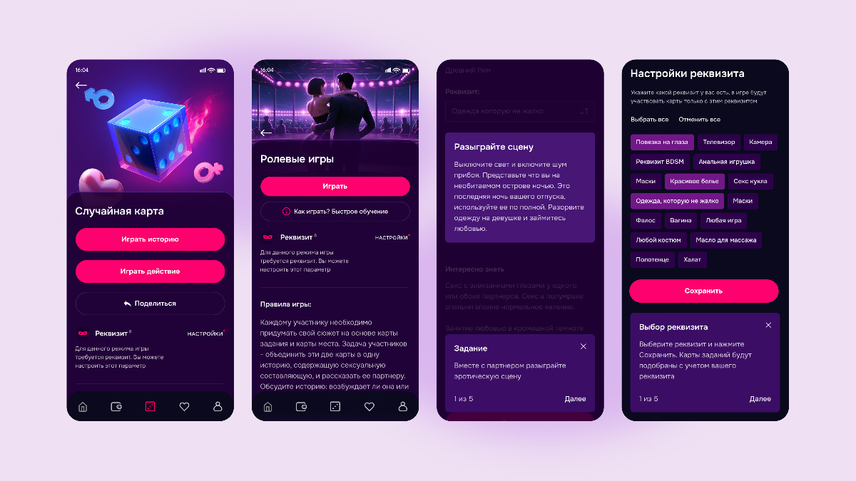 Тема 18+ накладывает дополнительные требования на визуал и интерфейс. Один неверный шаг — и продукт либо выглядит вульгарно, либо рискует не пройти модерацию стора. Мы сознательно отказались от клише и прямолинейных образов. Вместо этого сделали ставку на атмосферу: темные оттенки, неоновые акценты, ощущение ночного города и интриги. Это помогло сохранить настроение и не перейти границу.