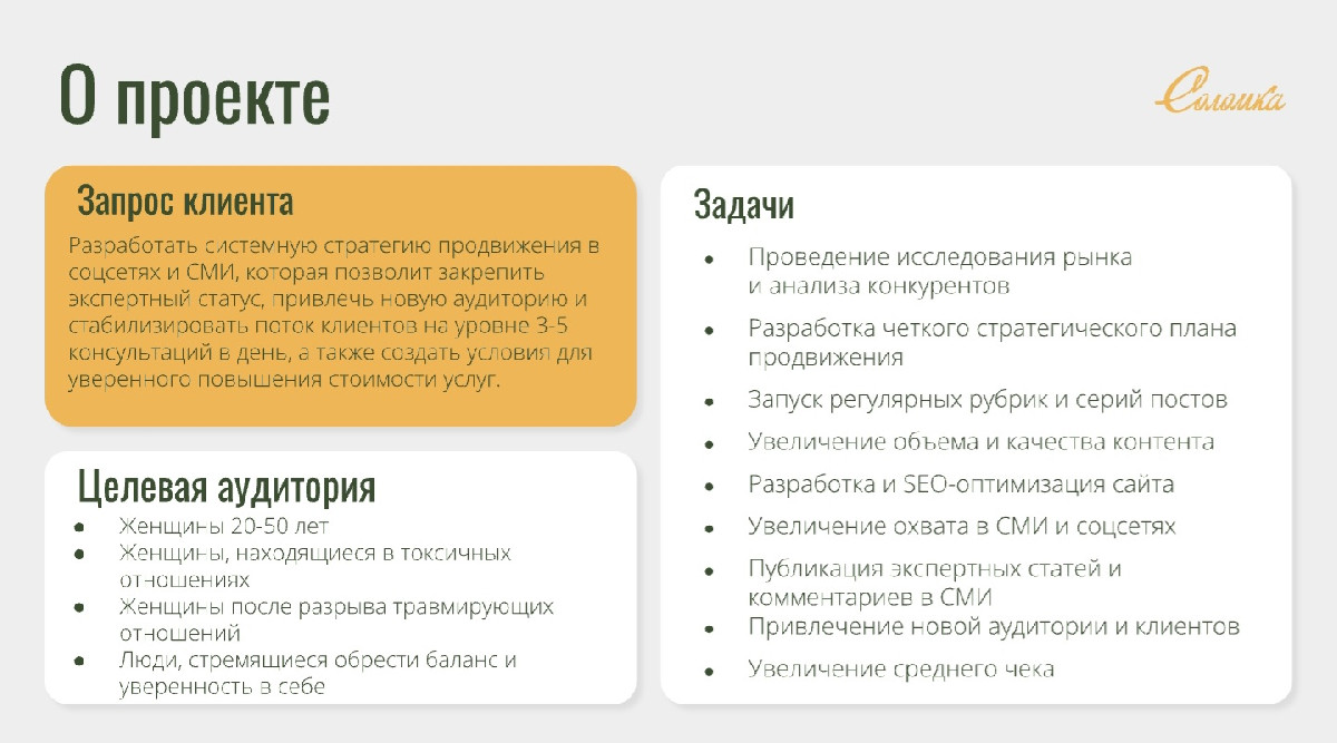 Разработать системную стратегию продвижения в соцсетях и СМИ для закрепления экспертного статуса в нише психологии и созависимости, привлечения новой целевой аудитории и стабилизации потока клиентов на уровне 3-5 консультаций в день с созданием условий для уверенного повышения стоимости услуг.
