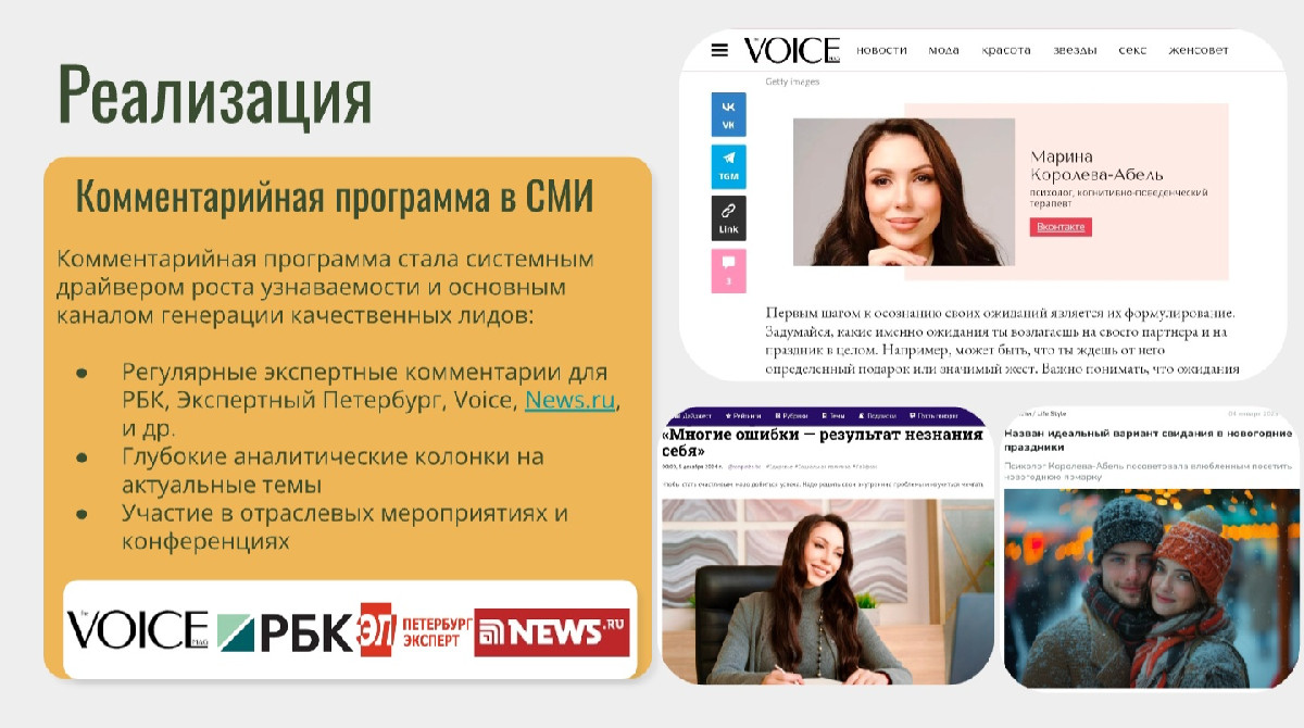 - Регулярные экспертные комментарии: налажено сотрудничество с РБК, News.ru, «Эксперт», Voice и др. Марина стала постоянным экспертом по психологическим и социальным темам.