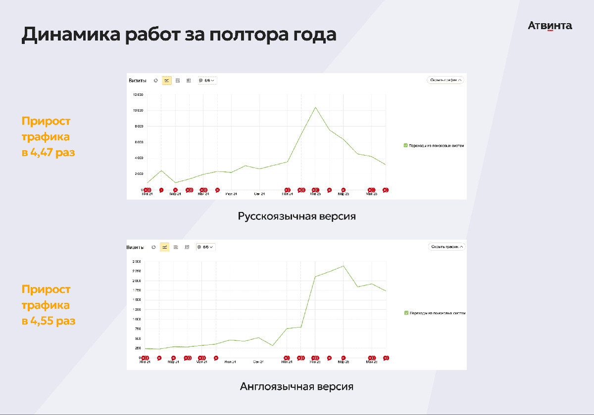 - В 5,5 раз составил рост трафика — с 1 847 до 10 115 визитов в месяц на русскоязычной версии и с 369 до 2 049 визитов в месяц на англоязычной.