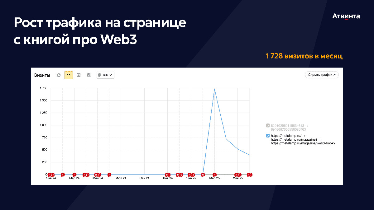 В пиковый месяц — март 2025 — книга принесла 1 728 визитов. Написание книги усиливает экспертность клиента, создает еще одно касание с аудиторией и является дополнительным каналом узнаваемости бренда в поиске.