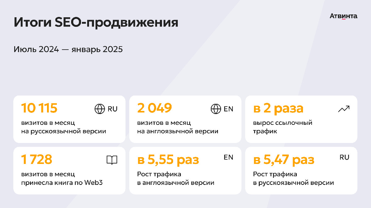 Мы внедрили улучшенную стратегию SEO-продвижения с упором на контент и добились устойчивого роста трафика на двух версиях сайта. Усилили статьи и коммерческие страницы, нарастили ссылочную массу и помогли клиенту выпустить книгу по Web3, которая дала дополнительный приток аудитории в блог.