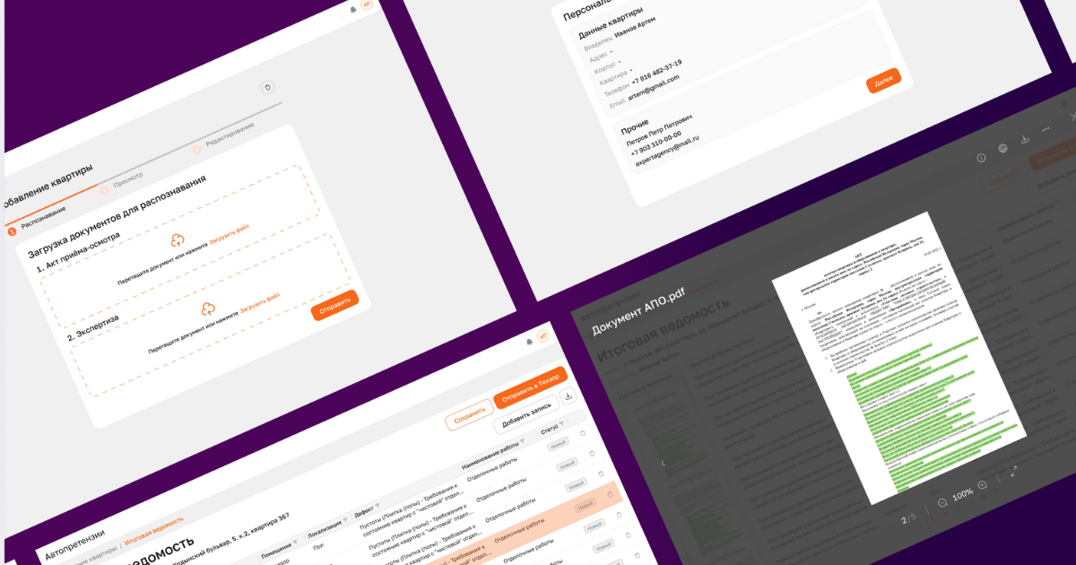 Сделали работу «сквозной»: пользователь заходит в веб-интерфейс, загружает документы, а система сразу распознаёт данные из АПО и экспертиз. Всё, что нужно поправить или уточнить, редактируется на месте — можно добавлять и удалять дефекты, виды работ, помещения и локализации