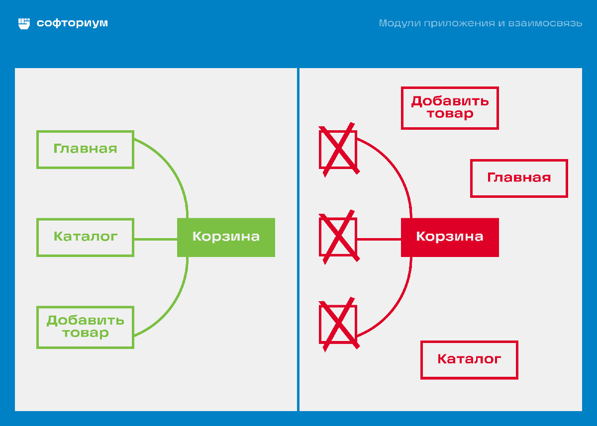 Если мы меняем что-то в корзине, то что-то придется поменять и в другом месте. Если переделываем корзину полностью, то, скорее всего, понадобится переписать все приложение и при этом все время фиксить связи корзины с другими модулями!
