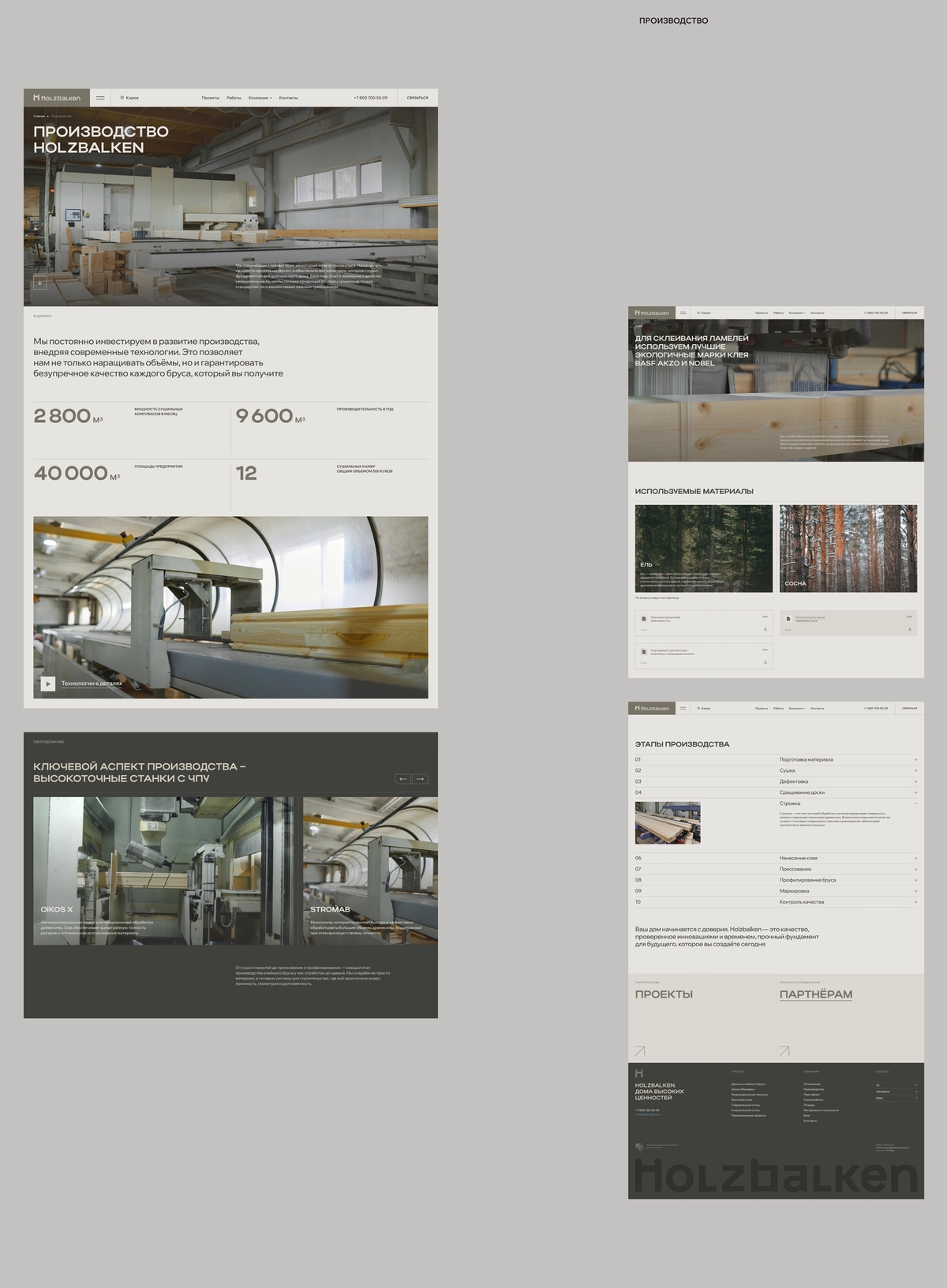 Раздел производство подкрепляет одно из важнейших преимуществ бренда - Хольцбалкен более 17 лет производит брус, что выгодно отличает их от многих конкурентов. Поскольку на сайт заходит и b2b-аудитория, которым бренд предлагает партнерство, этот раздел также работает в плюс