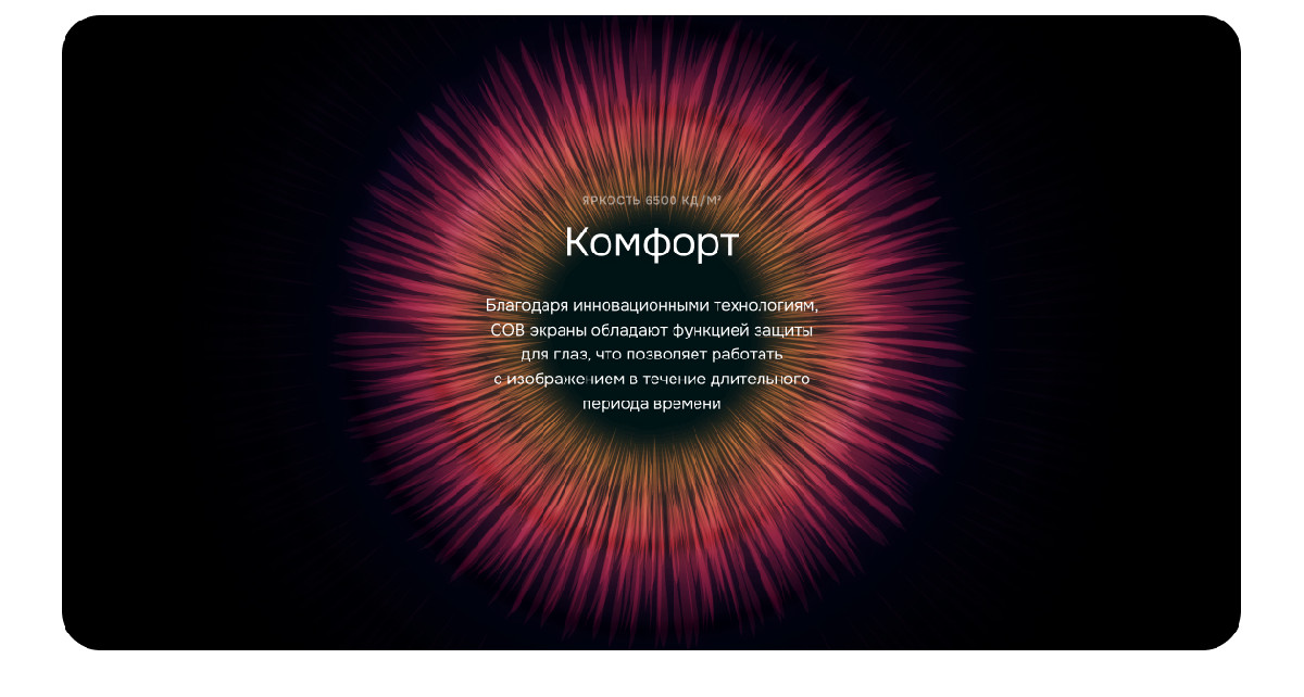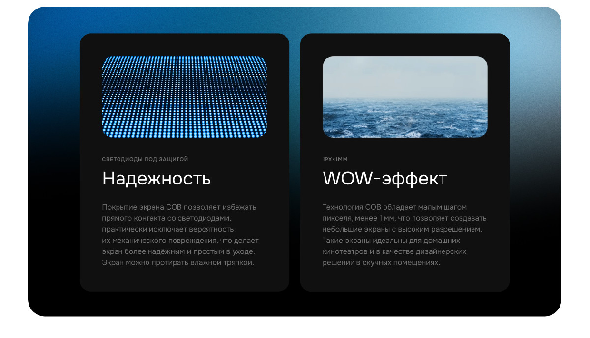 - COB-экраны: акцент на надежности, защите глаз и идеальной картинке.