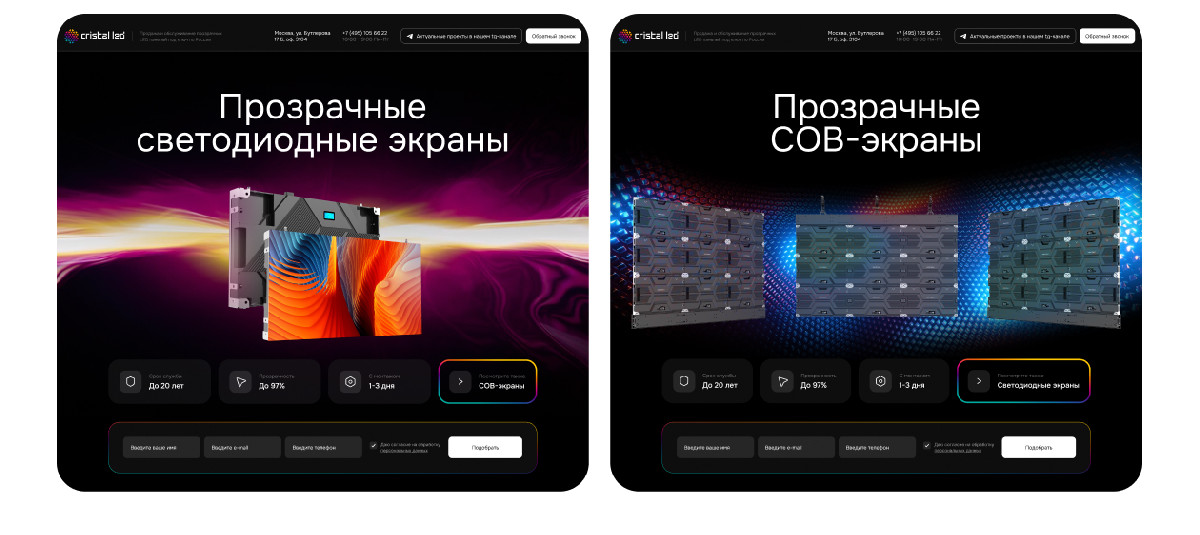Нужно было упаковать премиальные прозрачные экраны, не имея на руках качественного контента. Мы не стали спасать «мыльные» исходники ретушью, а создали фотореалистичную 3D-графику с нуля. Сделали сайт, который буквально светится и продает сложную технологию через визуал.