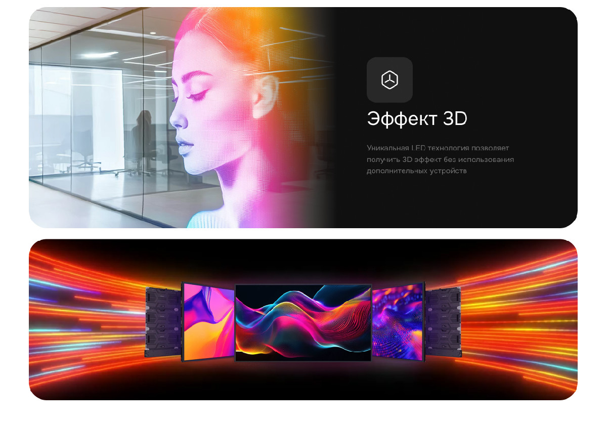 - Прозрачные экраны: акцент на легкости, монтаже на стекло и 3D-эффектах.