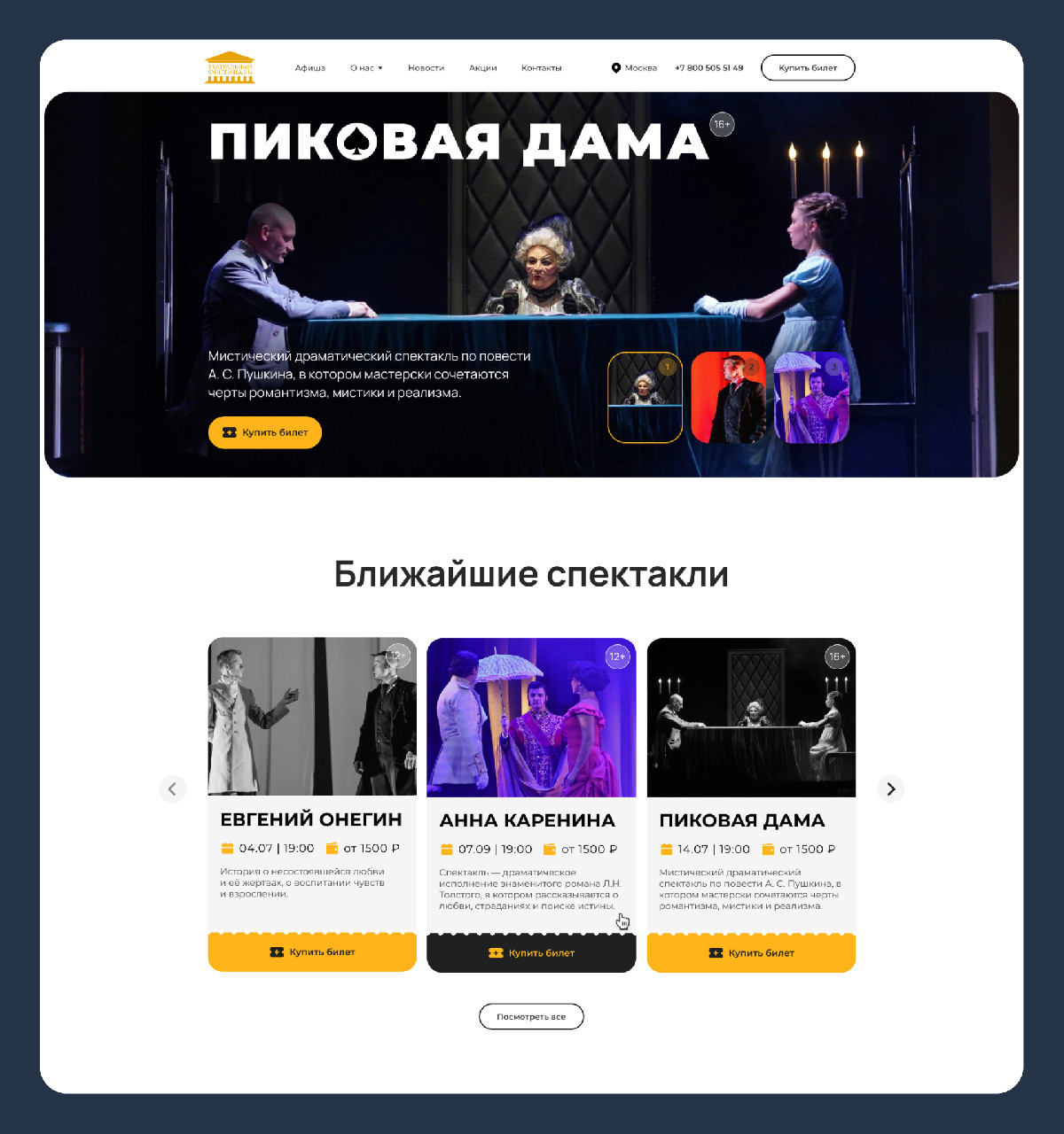 Крупные фотографии артистов и визуальный эффект направленного света создают ощущение сцены – будто уже поднялся занавес, и спектакль вот-вот начнётся. Вся композиция построена по центру – это помогает сфокусировать внимание на главном: афише и кнопке действия. Ближайшие спектакли вынесены в яркие карточки. Они хорошо читаются и сразу подсказывают, куда идти. Стилизованы под театральные билеты.