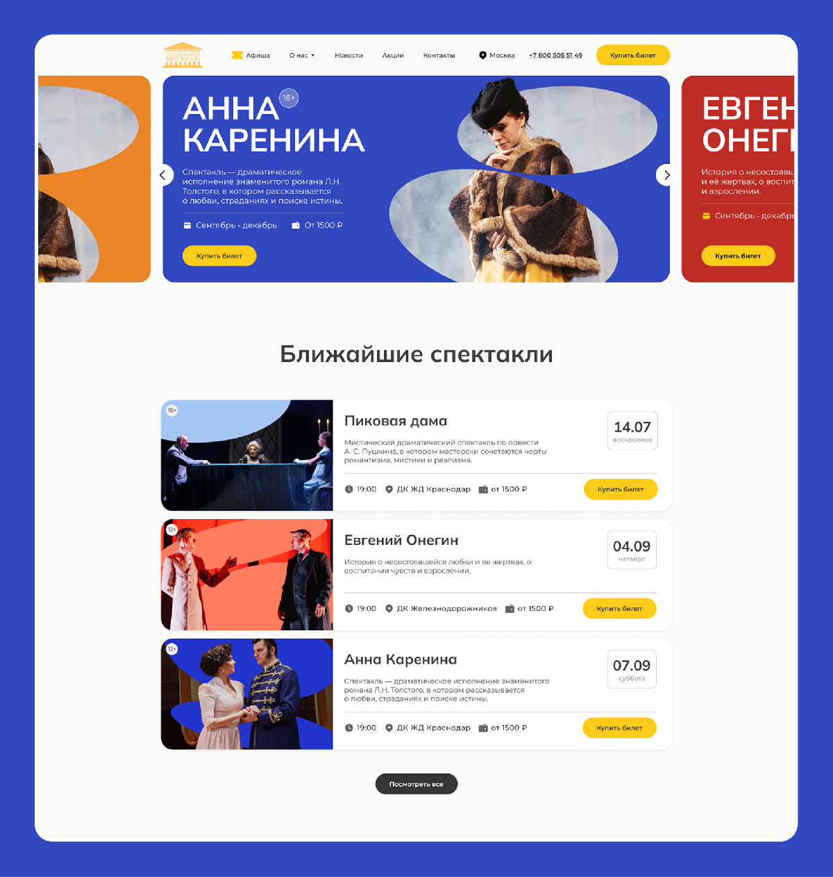 - настроили понятную структуру карточек спектаклей: с датами, временем, ценами и условиями покупки