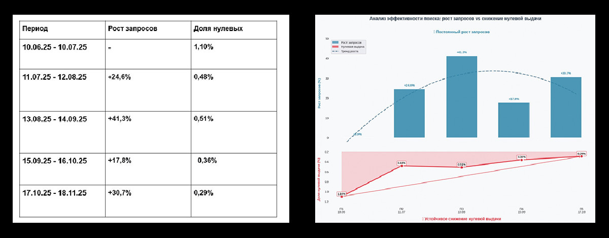 - Снижение доли нулевых запросов: в 1,7 раза.