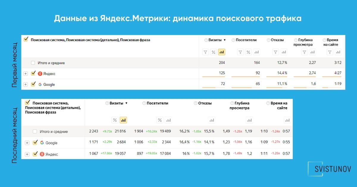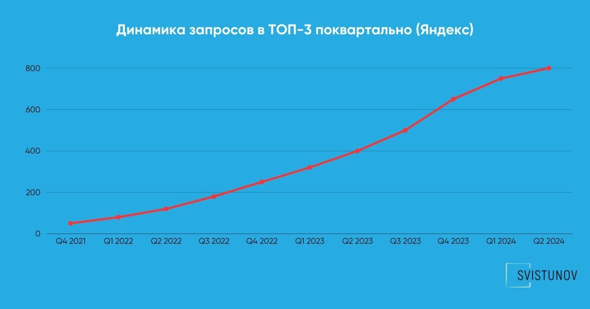 - Количество запросов в ТОП-3 выросло с 50 до 800, что напрямую повлияло на рост органического трафика.