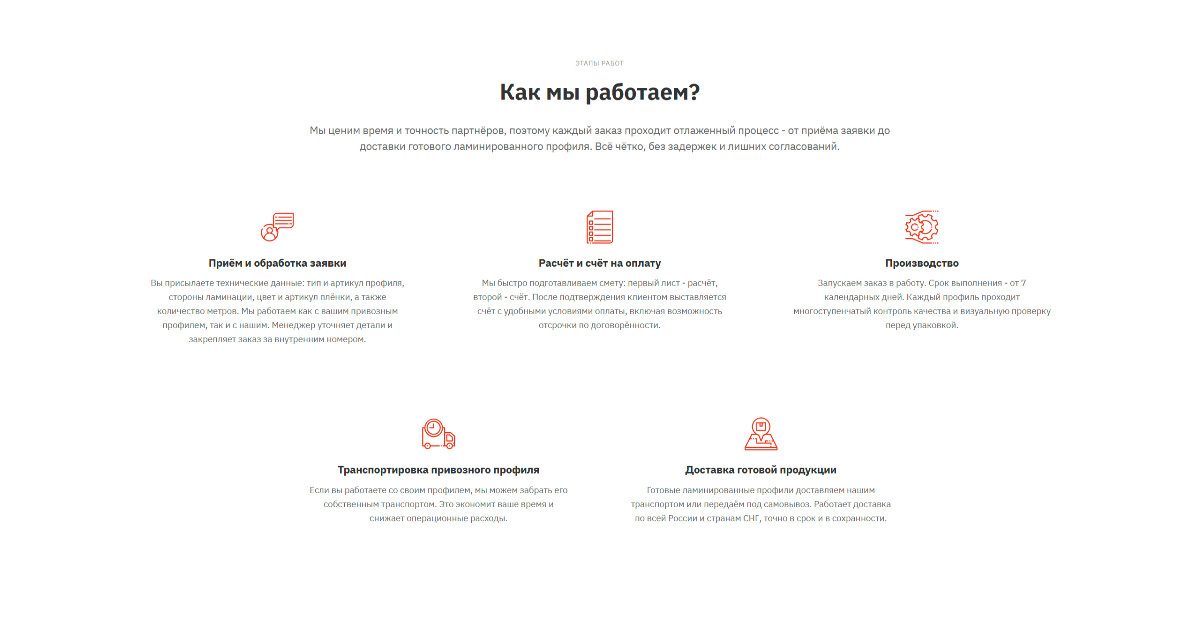 Разработали структуру, которая буквально «ведёт за руку»: от презентации компании к демонстрации процессов, к выгодам, к доверию, к заявке.