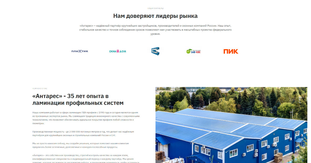 Когда к нам пришла компания «Антарес» - крупный игрок на рынке ламинации ПВХ-профиля - задача стояла не просто «сделать сайт». Нужно было создать лендинг, чтобы B2B-клиент, который привык считать каждую деталь, сразу видел: перед ним не посредник, а производитель с 30-летней историей, высоким качеством и мощностями в 2 млн погонных метров в год.