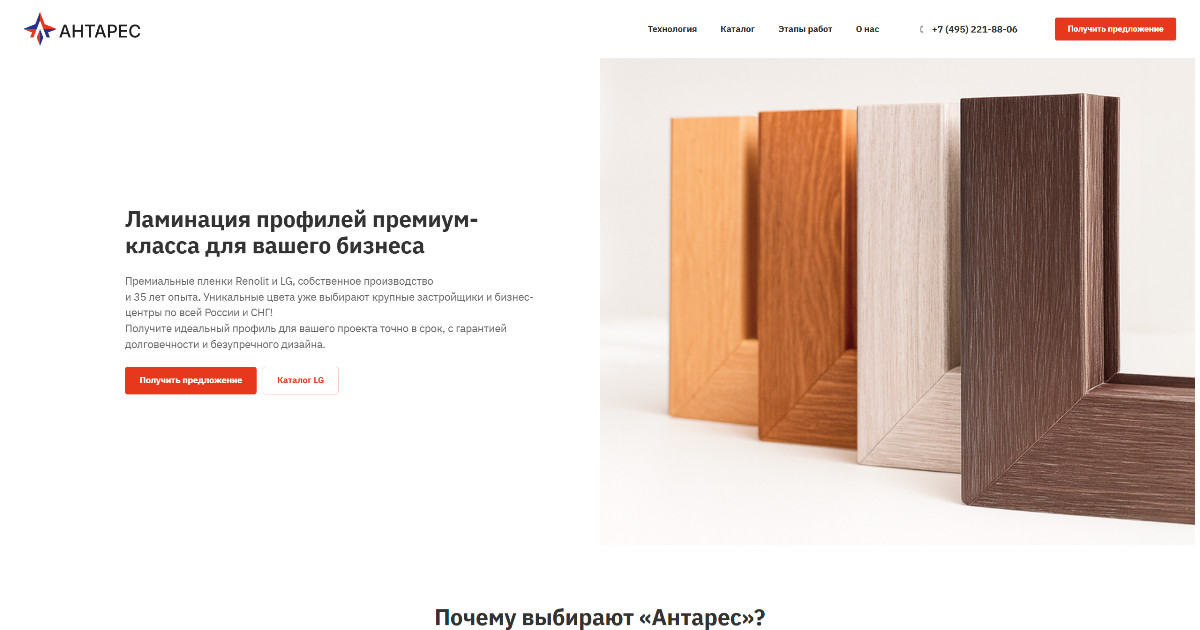 Когда к нам пришла компания «Антарес» - крупный игрок на рынке ламинации ПВХ-профиля - задача стояла не просто «сделать сайт». Нужно было создать лендинг, чтобы B2B-клиент, который привык считать каждую деталь, сразу видел: перед ним не посредник, а производитель с 30-летней историей.