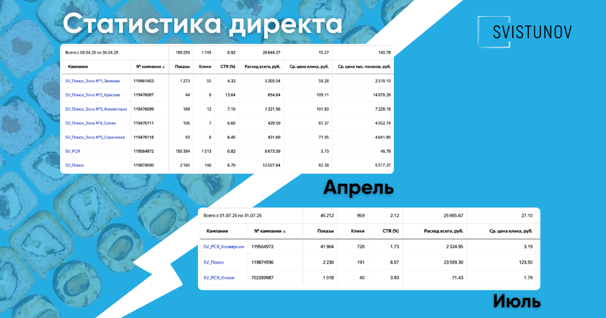 Самый сильный эффект дала донастройка Поиска: в июле всего за 8 дней Поиск принёс 20 заказов при расходе 10 000 ₽ — окупаемость ×3. Финальный тест (24.07–08.08): 26 000 ₽ расхода → 23 заказа на 37 000 ₽, при этом CTR в Поиске превысил 7%, а CPC в РСЯ держался ниже 4 ₽.