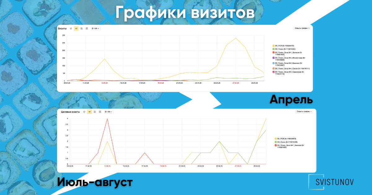 Параллельно мы занялись аналитикой. В Яндекс.Метрике была некорректно настроена цель «добавление в корзину» — её починили. Также обнаружили пересечения с кампаниями Яндекс.Бизнеса, которые клиент вёл самостоятельно.