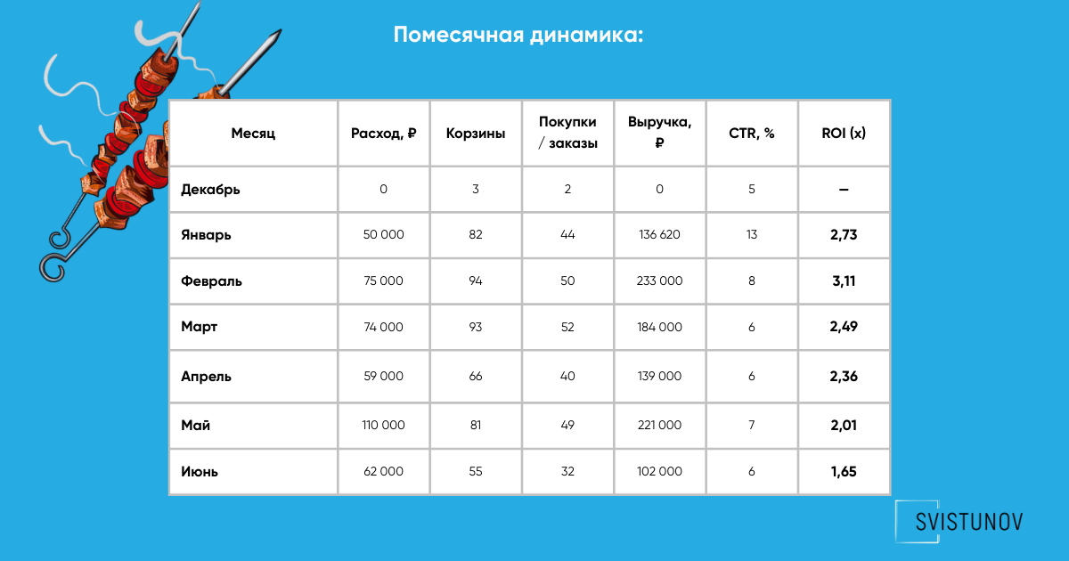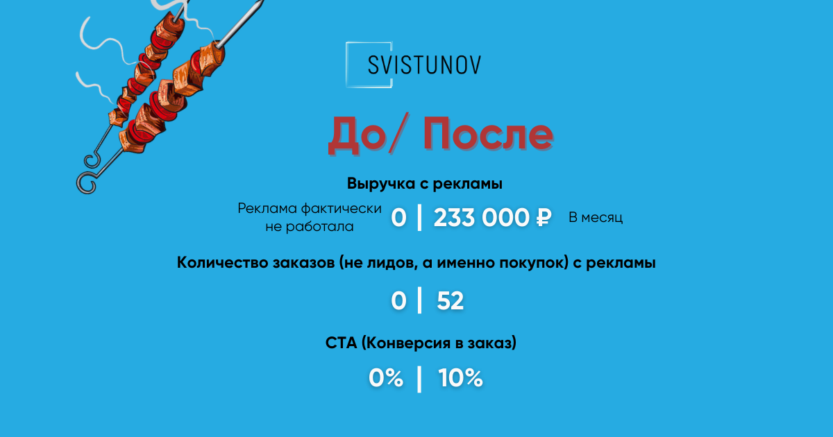 Запустили Яндекс Директ с нуля для доставки шашлыка в Красноярске. Разделили город по зонам и офферам, отключили нерентабельные районы, регулярно оптимизировали кампании. В итоге реклама стала стабильным каналом продаж: выручка чаще превышала расход в 2–3 раза.
