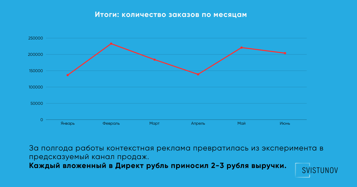 За период работ контекстная реклама перестала быть экспериментом и стала предсказуемым каналом продаж, где выручка почти всегда превышала рекламные расходы в 2–3 раза.