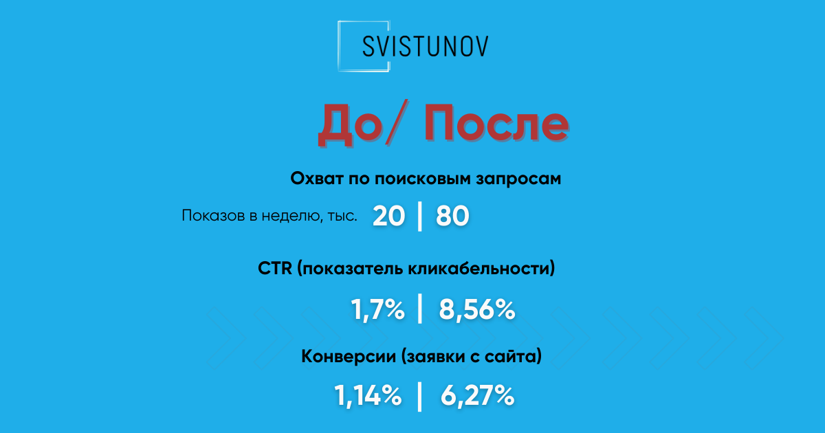 Увеличили охват рекламы в Пензенской области с 20 тыс. до 80 тыс. показов в неделю за 5 месяцев. CTR в лучших кампаниях — до 8,56%. Настроили систему РСЯ и имиджевых размещений под длинный цикл сделки.