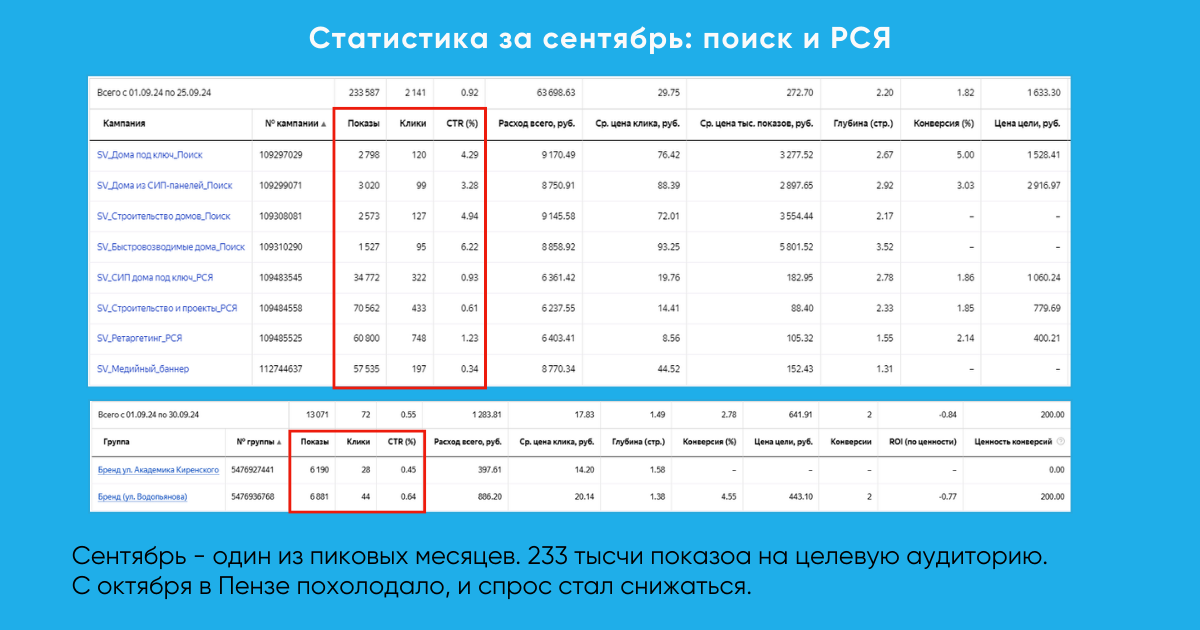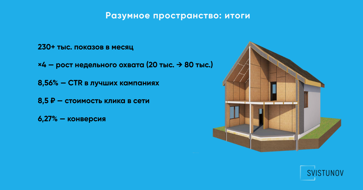 По итогам работ конверсии доходили до 6,27%, а имиджевые размещения обеспечили до 103 тыс. показов в месяц. В результате бренд Разумного пространства стал заметнее в Пензе и области: когда человек “дозревает” до решения строить дом, он уже знает компанию и возвращается к ней как к знакомому варианту.