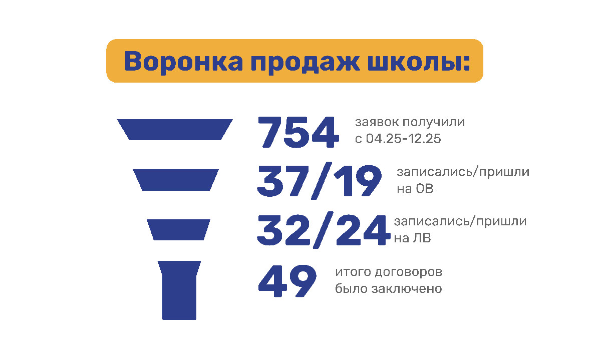 3. Но главной задачей было перевести эти лиды в заключенные договоры с родителями будущего ученика. Мы помогли успешно заключить 49 договоров за время работы, а эффективность продаж составила 6,5%.