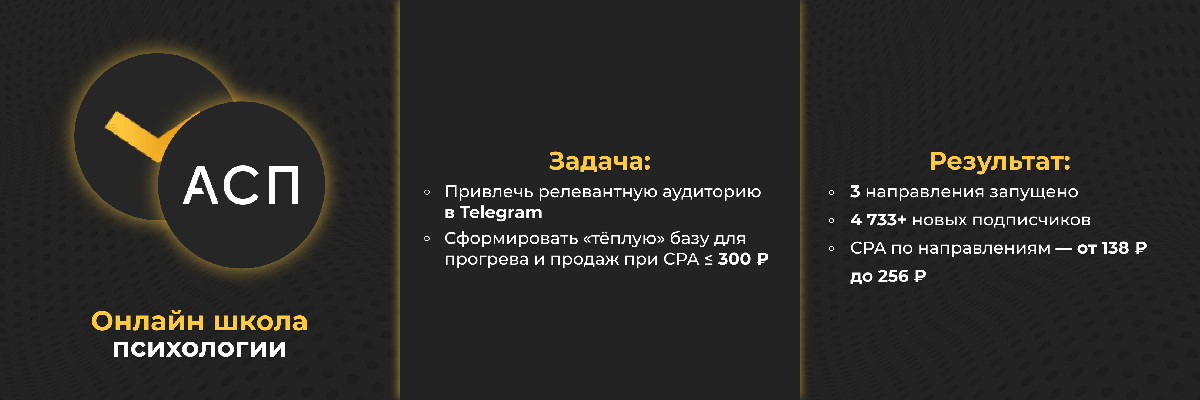 В кейсе рассказали, как за 11 закупов привели 4733+ подписчиков по 243₽ для онлайн-школы психологии.