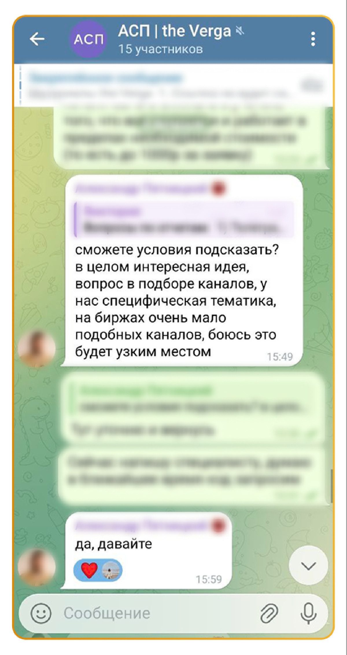 Кроме того, мы не отправляем шаблонные тексты, а вовлекаем админов в содержание: объясняем, чем проект отличается, обсуждаем формулировки. Часто админ переписывает пост под свой стиль, добавляет личный опыт, отвечает на вопросы. Получается не реклама, а рекомендация от коллеги — а значит, выше доверие и конверсия.