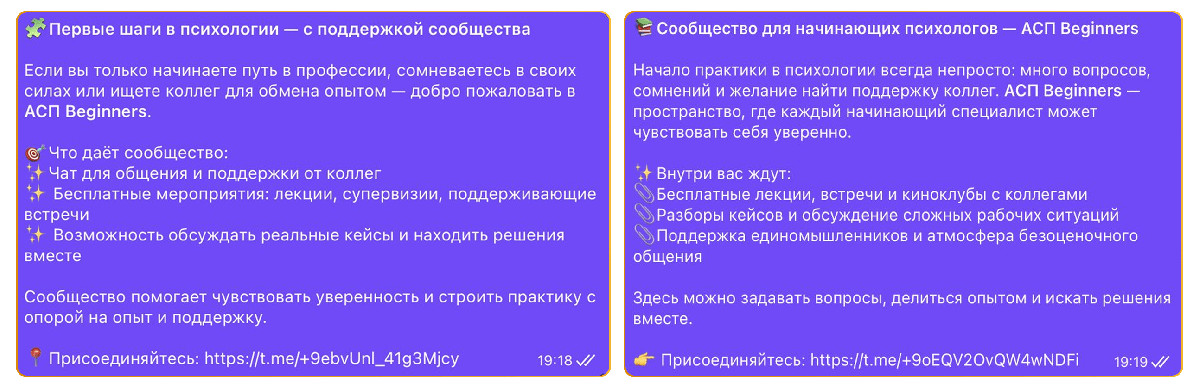 1. Не начинали с нуля — взяли уже проверенные площадки, которые лучше всего сработали на основном канале АСП. Ставку сделали на авторов, а не на «витрины»: авторские каналы практикующих психологов (там ядро доверия и много начинающих «учатся у человека») и профильные каналы с материалами/методичками (там новички «сидят постоянно»).