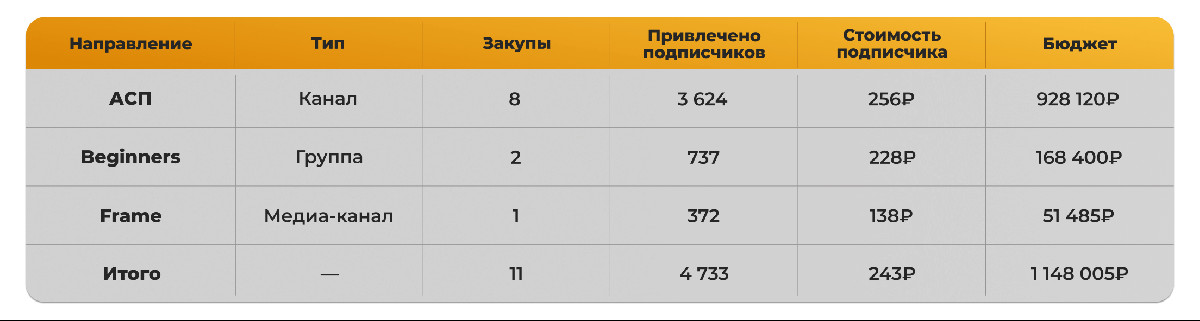 После каждого размещения фиксировали результат в таблице и оставляли в закуп только то, что стабильно приносит аудиторию без всплеска отписок.