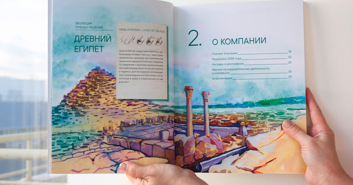 Для воплощения этой идеи мы подобрали 12 интересных и познавательных фактов из истории создания труб — с древности и до наших дней — и нарисовали к ним дюжину красочных детализированных иллюстраций. Все рисунки выполнены в технике акварели, что позволяет создать эффект человеческого участия и рукотворности и помогает сформировать нужную атмосферу для восприятия информации, изложенной в отчёте.