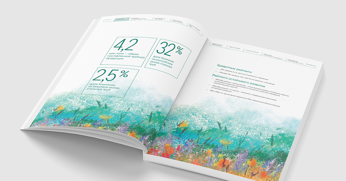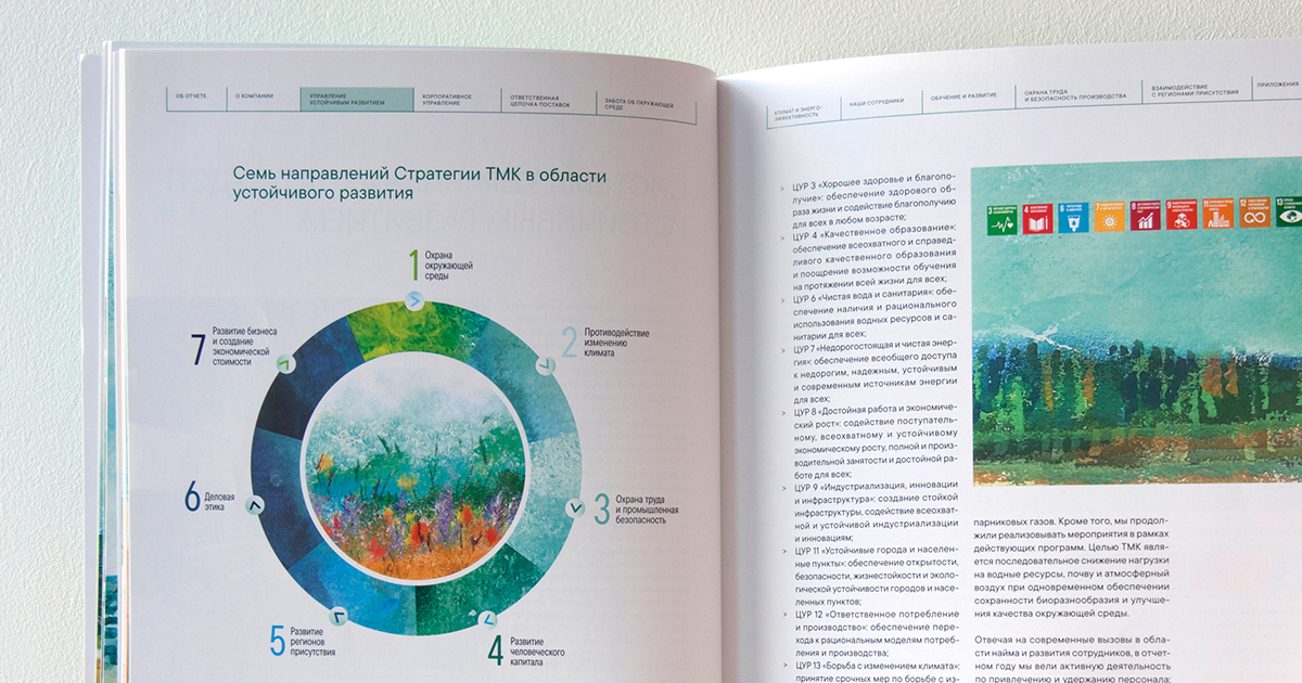 Для Трубной Металлургической Компании — ведущего поставщика трубных решений, конструкционных материалов и сопутствующих сервисов — необходимо разработать концептуальный дизайн оформления отчёта об устойчивом развитии.