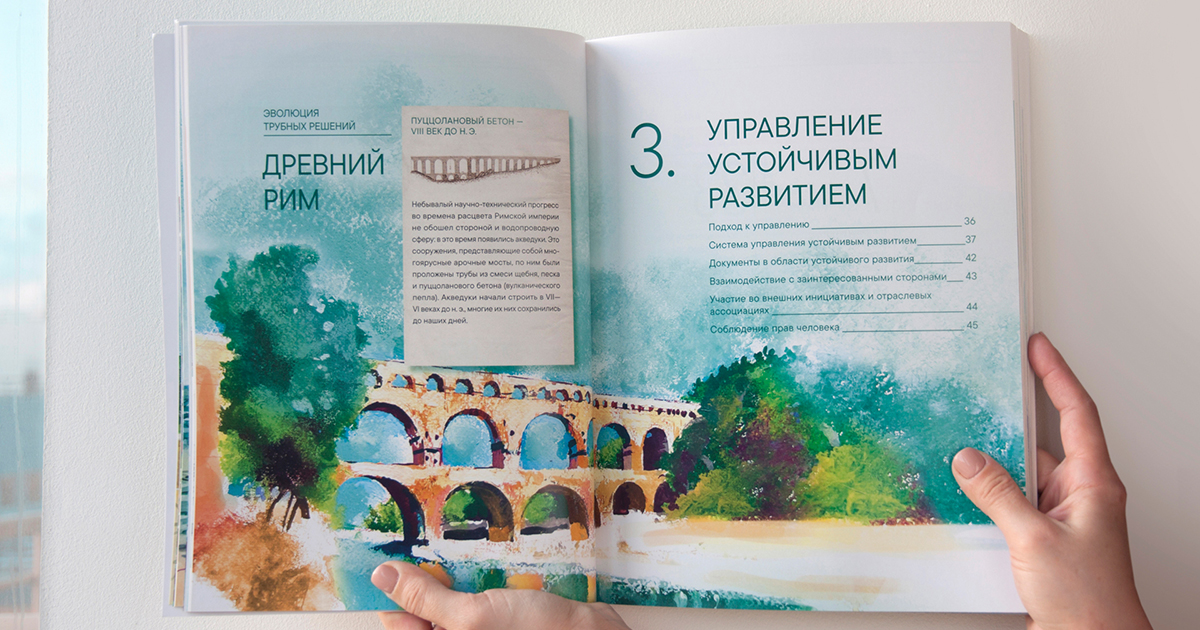 Отчёт об устойчивом развитии компании ТМК рассказывает об истории возникновения труб и развитии технологий их производства. Оригинальная концепция и дизайн оформления отчёта разработаны брендинговым агентством ДизайнДепо.