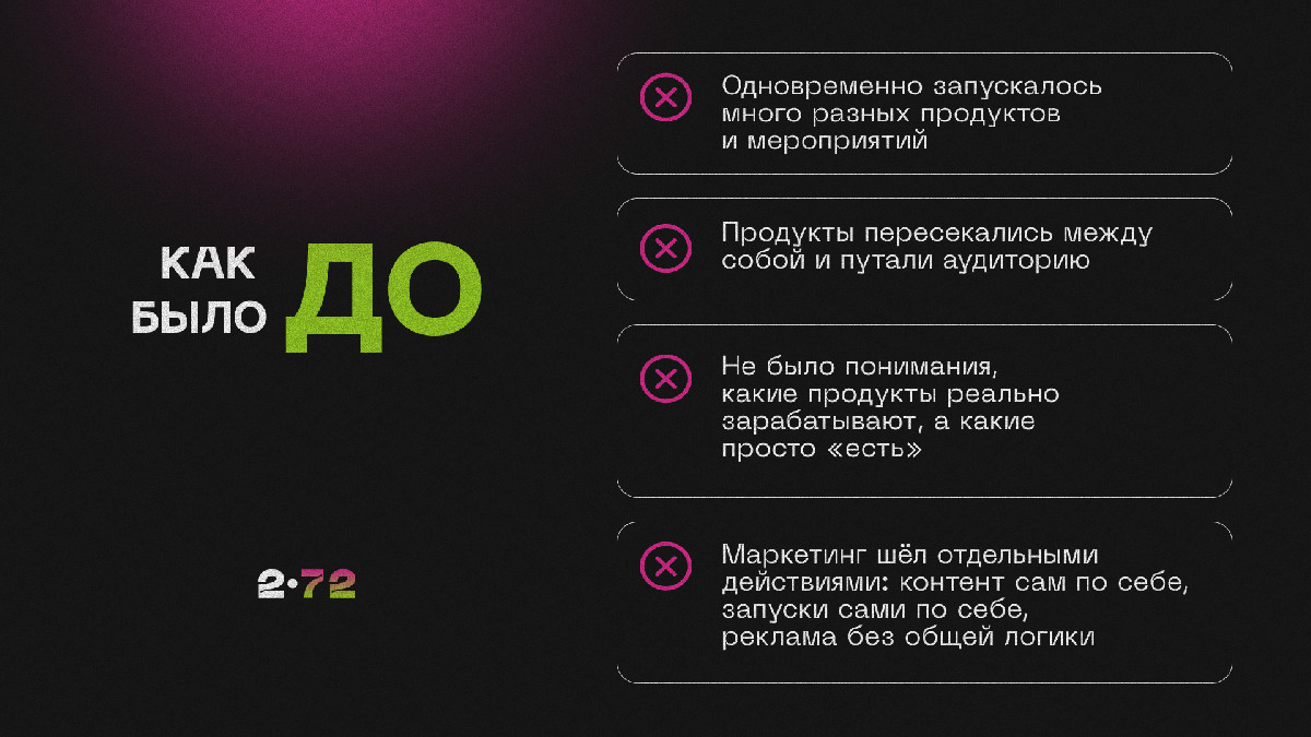 2. Перешли к стратегии вместе с командой ради “приборки” в продуктахНа стратсессии:1.окончательно утвердили флагманские продукты;2.разобрали воронку продаж под каждый из них;3.нашли точки роста и слабые места;4. посмотрели, какие продукты стоит оставить, а какие убрать совсем;