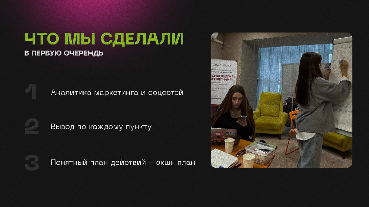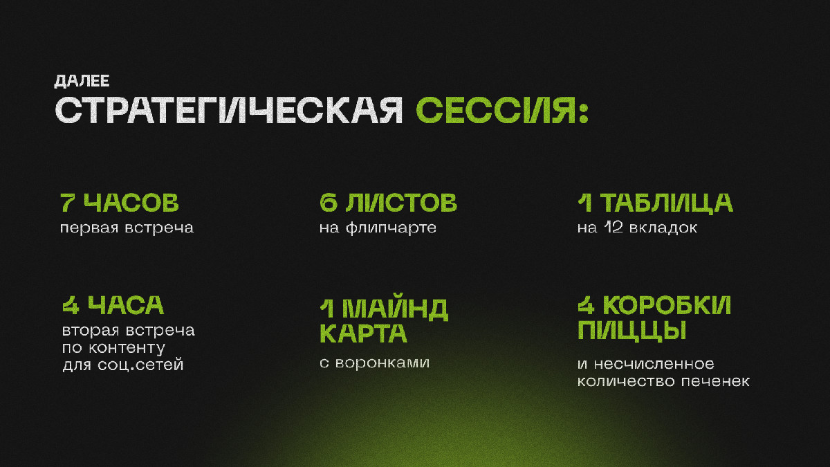 1. Мы начали не с продвижения, а с аналитики бизнеса, по итогам собрали большую презентацию, где: