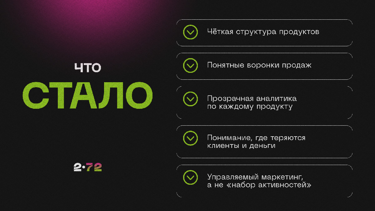 Как вместо хаотичного маркетинга компания получить: чёткую структуру продуктов, понятные воронки продаж, прозрачную аналитику и управляемый бюджет. Мы нашли точки, где теряются клиенты и деньги, и превратили их в точки роста.