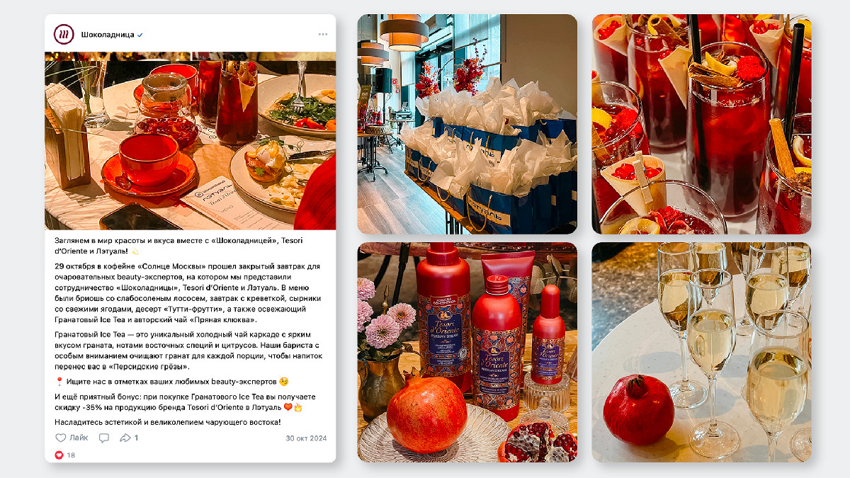 - Событийный контент — интеграции с блогерами, анонсы детского меню и мероприятий (например, блинное воскресенье).