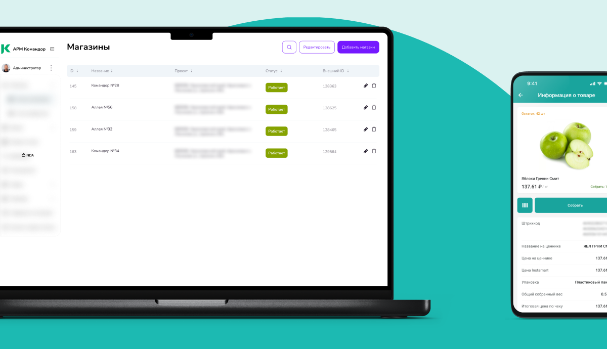 Чтобы создать IT-решение, которое действительно будет полезно «Командору», мы работали в тесной связки с экспертами холдинга, вместе с ними погружались в бизнес-процессы. Разработали сервис, в котором сборщик просматривает заказ, отмечает прогресс сбора, связывается с покупателем, если нужно убрать или заменить позицию. Приложение интегрировано с сервисами Купер, Яндекс.Еда и другими, чтобы получать заказы. Кроме этого заказчику нужна была автоматизация процессов сверки с агентами и сторонними маркетплейсами, чтобы супервайзеры могли производить операции с заказами, которые недоступны сборщикам: отмену, переназначение на другой магазин или сотрудника. Также в личном кабинете должны быть дашборды со статистикой заказов, инструменты для создания магазинов и управления ими, управление сборщиками — создание новых, выдача доступа.